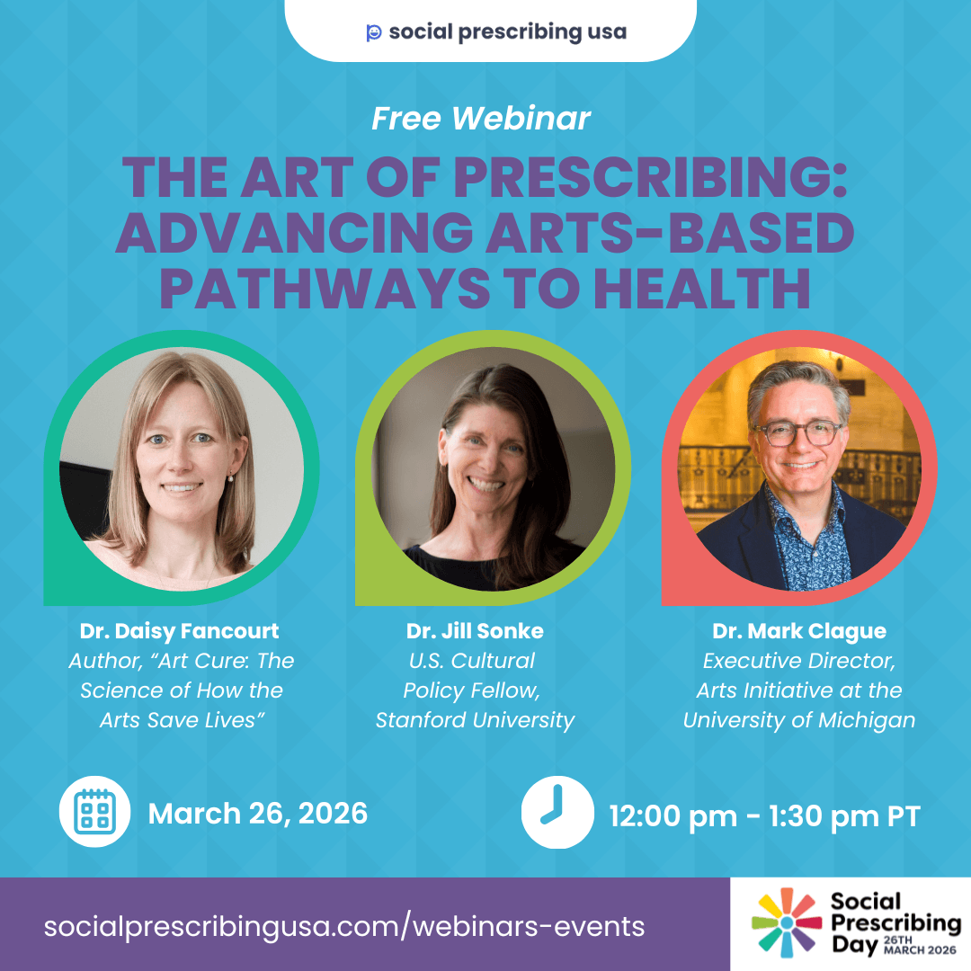 As social prescribing continues to gain traction across the U.S. and globally, the arts are emerging as a powerful and evidence-informed modality for improving health and well-being. In recognition of Social Prescribing Day 2026, this webinar will explore the growing momentum of arts-based approaches within social prescribing frameworks. Speakers will highlight how arts and cultural engagement support mental health, social connection, and community resilience, while sharing examples of implementation across health, public health, and community settings. The webinar will also examine what other social prescribing modalities—such as nature-based and service-oriented prescribing—can learn from arts prescribing. Participants will gain insight into why the arts matter in social prescribing, what’s driving current growth, and how cross-sector partnerships can help sustain and scale this work. Learn more and register at https://www.socialprescribingusa.com/webinars-events.