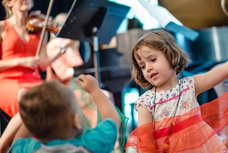 Mozart for Munchkins programs are designed with this relational dimension in mind. The barrier between performer and audience is fluid: musicians walk into the audience, and families sit close — on the floor, in chairs, or dancing to the music. Children of all ages are encouraged to move, listen, sing, and explore. Adults of all ages participate rather than let music wash over them passively. At institutions such as the Museum of Modern Art and Hudson Yards, concerts pairsound with visual art and reflection: draw what you hear, actively think about what sounds bring up certain colors, inviting families to be a part of the performance, rather than just consume. Audience members frequently describe these experiences as grounding, connective, and restorative.