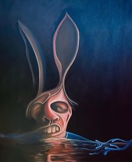 Have you ever looked at a cloud and thought you saw an animal, or looked at a wood grain pattern and thought you saw a face? If so, you were experiencing pareidolia (Per-î-dõl-ya) the term used to describe why we see identifiable forms, faces and meaningful images in random or ambiguous visual patterns. I use pareidolia as a resource, creating paintings of rabbits, bugs, people with abnormal features, and mythological creatures, all from my shower!