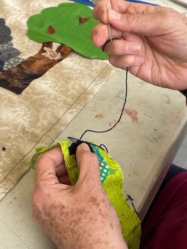 Story cloths are an ancient practice found in diverse settings. In a safe and supportive environment, women come together to sew stories that may be difficult to express in words into cloth. The repetitive nature of sewing regulates the body’s responses, while depicting their story in imagery encourages non-verbal self-expression.