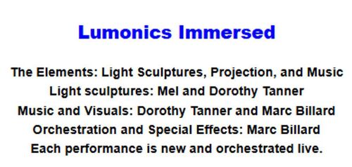 I am part of the Lumonics Light & Sound Gallery, one of the first and longest-running light art projects in the US, based in Denver, CO. I am co-archivist of 200+ light sculptures by the late Dorothy and Mel Tanner, co-producer of Lumonics Immersed. and host of field trips and guided tours for students of all ages. Wellness and stimulating creativity are important aspects of our project.